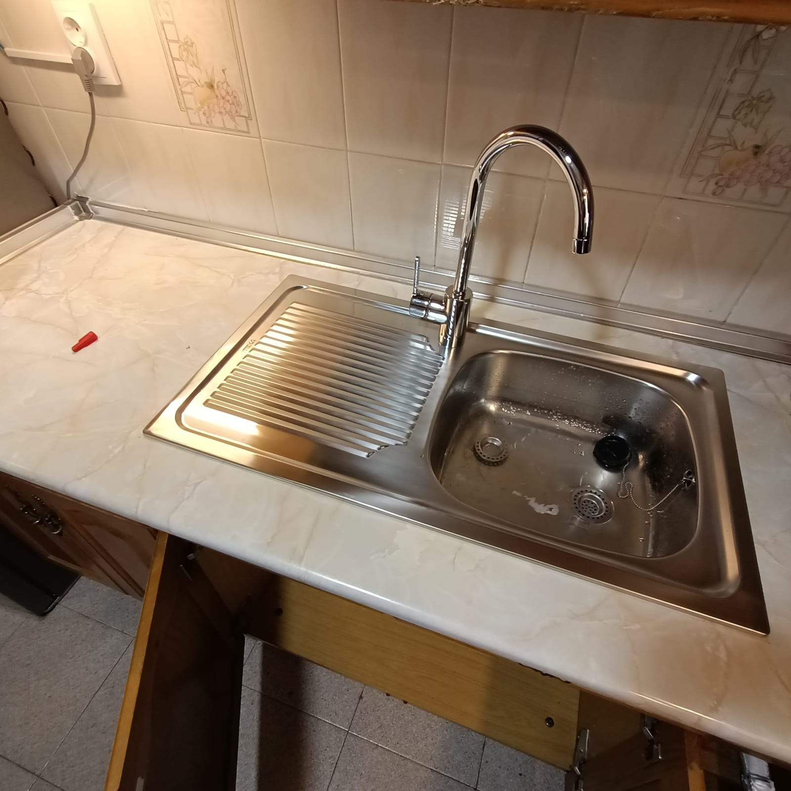 Instalación de toma de desagüe y llave de alimentación, Montaje de fregadero y grifo.